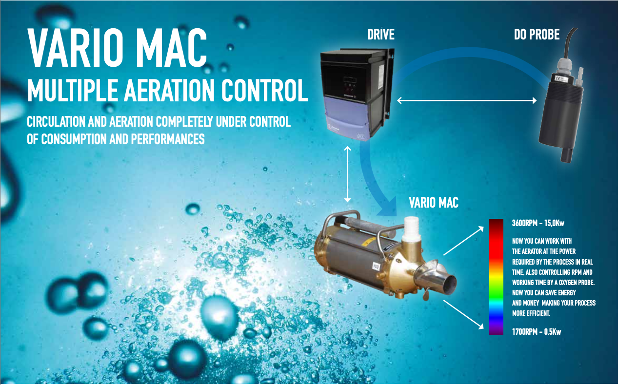 El Stormix Vario MAC (MAC por Multiple Aeration Control) es un aireador eléctrico submergible con control de velocidad variable (potencia hasta 15 HP) .
