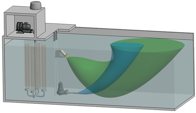 Esta combinación favorece al aumento de tiempo de contacto entre el aire y el agua y permite lograr un rendimiento muy alto con un porcentaje óptimo de transferencia de oxígeno al agua. Los sistemas combinados ofrecen una transferencia de oxígeno hasta 10 veces superior a la de un simple aireador y eso con muy poca energía adicional.