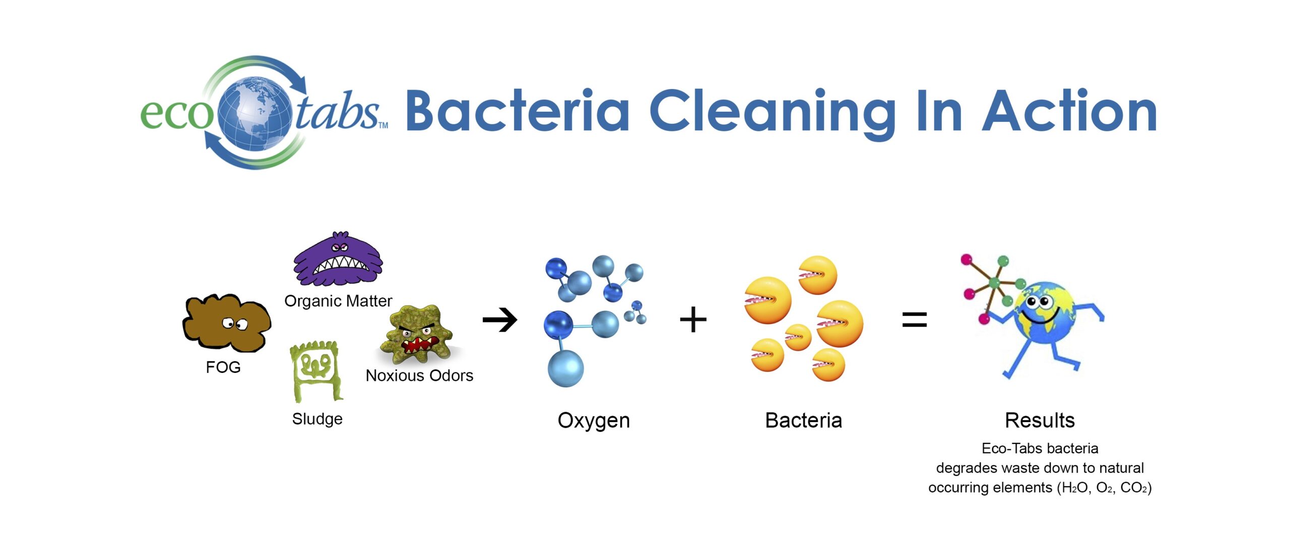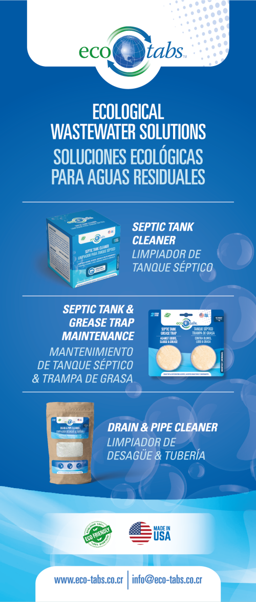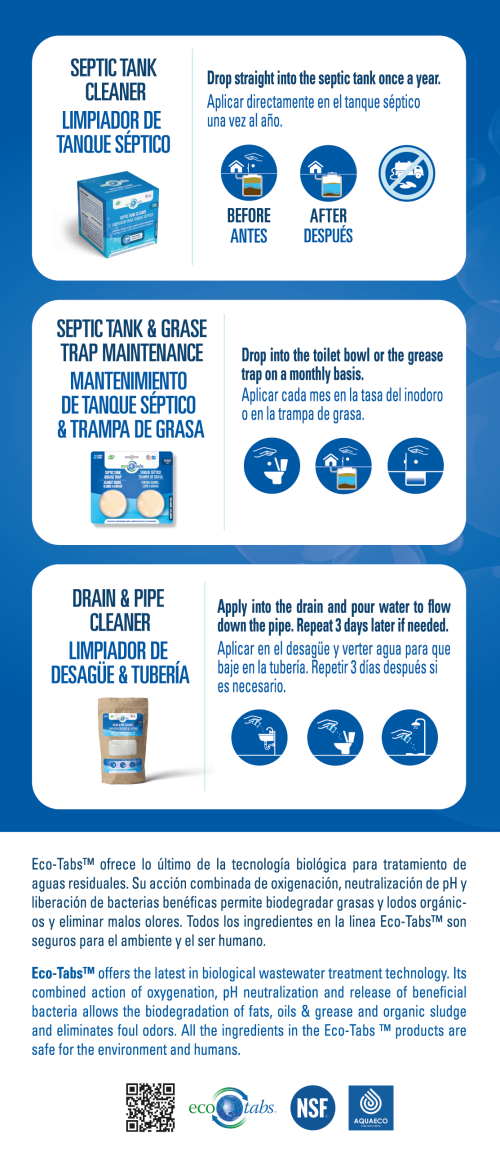 Los productos EcoTabs™ reducen las acumulaciones en tanques sépticos, trampas de grasa, cañerías y drenajes, mejoran la calidad del agua y controlan los malos olores sin necesidad de bombeo o limpieza mecánica.